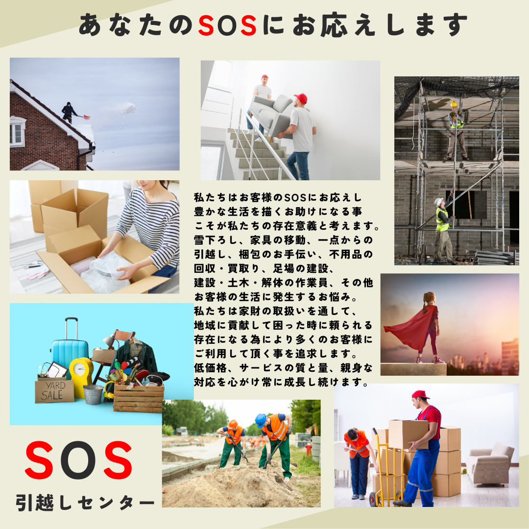 引越し、不用品回収・買取り、家財移動、梱包お手伝い、屋根の雪下ろし、その他お困り事